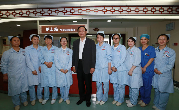 5月8日,國家衛生計生委副主任、國家中醫藥管理局局長王國強在江西省中醫院調研時,慰問了正在值班的護理人員。王國強說,馬上就要到護士節了,在這里,我代表國家衛計委、國家中醫藥管理局,對你們表示節日慰問的祝賀,你們辛苦了。王國強和現場的護士們一一握手,并熱情地邀請大家合影留念。