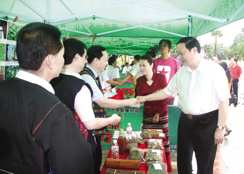 衛(wèi)生部副部長、國家中醫(yī)藥管理局局長王國強(qiáng)(右一)等領(lǐng)導(dǎo)在活動現(xiàn)場慰問義診專家。記者 高新軍/攝 傣醫(yī)專家在活動現(xiàn)場為群眾診病。記者 高新軍/攝 6月2日,“中醫(yī)中藥中國行”走進(jìn)柔情傣鄉(xiāng)、" />