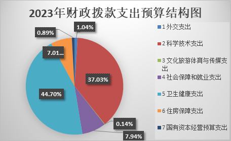 外交支出1478萬元,占0.70%;科學技術支出81143.94萬元,占38.26%;文化旅游體育與傳媒支出123萬元,占0.06%;社會保障和就業支出15994.05萬元,占7.54%;衛生健康支出95746.23萬元,占45.15%;住房保障支出17586萬元,占8.29%。