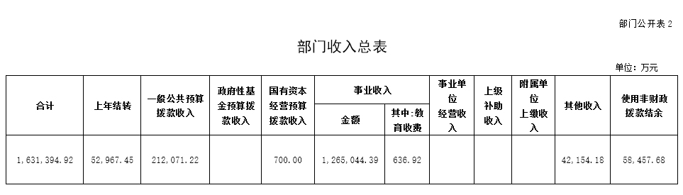 2023年收入預算1631394.92萬元,其中:一般公共預算撥款收入212071.22萬元,占13.00%;國有資本經營預算撥款收入700萬元,占0.04%;事業收入1265044.39萬元,占77.54%;其他收入42154.18萬元,占2.58%;使用非財政撥款結余58457.68萬元,占3.58%;上年結轉52967.45萬元,占3.25%。