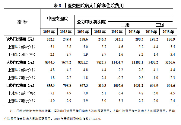 2019年,中醫類醫院次均門診費用262.2元,按當年價格比上年上漲5.1%,按可比價格上漲2.1%;人均住院費用8044.3元,按當年價格比上年上漲4.8%,按可比價格上漲1.8%。日均住院費用855.3元(見表8)。