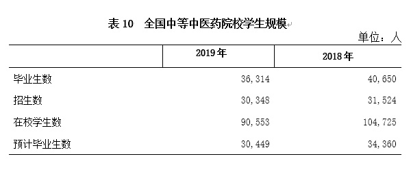 2019年,全國中等中醫藥學校畢業生數36,314人、招生數30,348人、在校學生數90,553人、預計畢業生數30,449人。與2018年相比,畢業生數、招生數、在校生數、預計畢業生數均有所減少,降幅分別為10.7%、3.7%、13.5%、11.4%。(見表10)。