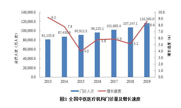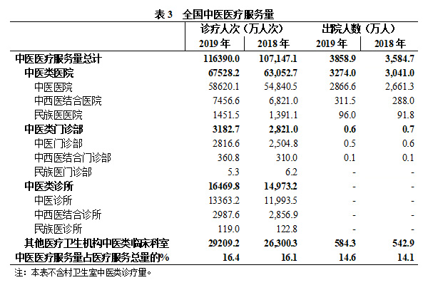 2019年,全國中醫總診療人次達11.6億人次,比上年增加0.9億人次,增幅8.6%;中醫診療量占全國總診療量的16.4%。其中:中醫類醫院6.8億人次、中醫類門診部及診所2.0億人次、其他醫療衛生機構中醫類臨床科室2.9億人次。