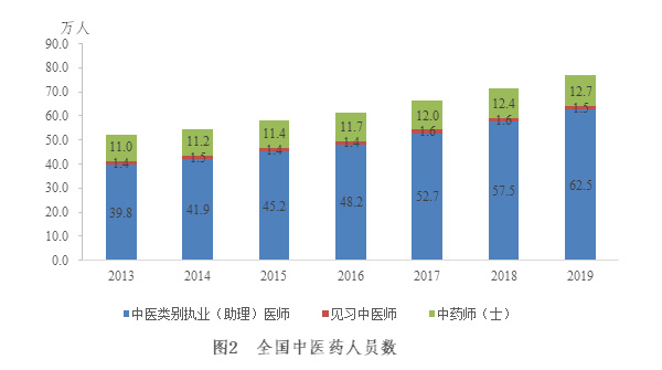 在中醫藥人員構成中,中醫類別執業醫師533,620人、中醫類別執業助理醫師91,163人、中藥師(士)127,154人、見習中醫師15,302人,與2018年相比,中醫類別執業醫師、中醫類別執業助理醫師和中藥師(士)分別增加了44,038人、5,291人、3,241人,增幅分別為9.0%、6.2%、2.6%;見習中醫師減少了268人,降幅為1.7%(見表2、圖2)。