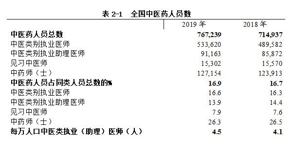 全國衛生機構中,中醫藥人員總數為767,239人,比2018年的714,937人,增加了52,302人,增幅7.3%。目前,全國中醫藥人員占全國衛生技術人員比例為7.6%,比2018年增長0.1個百分點;全國中醫藥人員占全國醫藥人員的比例達16.9%,略高于2018年的16.7%。