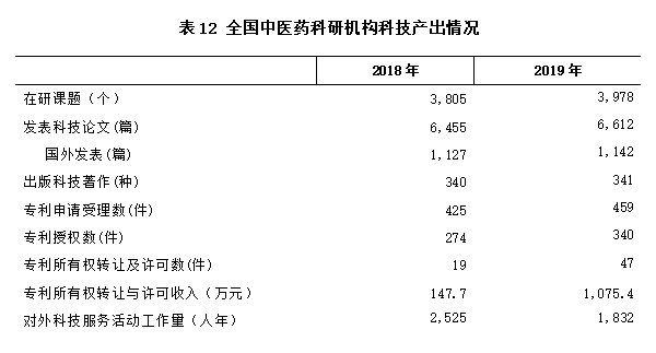 2019年,全國中醫藥科研機構在研課題共3,978個,比2018年的3,805個增加了173個,增幅4.5%。發表科技論文6,612篇,其中國外發表1,142篇,出版科技著作341種。比2018年全國中醫藥科研機構發表的6,455篇科技論文增加了157篇,增幅為2.4%。
