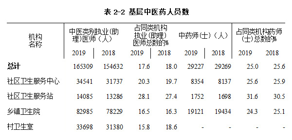 2019年全國基層中醫類別執業(助理)醫師達165,309人,比2018年增加10,677人,增長率為6.9%;社區衛生服務中心、社區衛生服務站、鄉鎮衛生院和村衛生室的分別較2018年增長2,804、799、4,756和2,318人,增長率分別為8.8%、6.0%、6.1%和7.4%。2019年基層中醫類別執業(助理)醫師占同類機構執業(助理)醫師總數的17.6%,較2018年下降0.4個百分點;社區衛生服務中心、社區衛生服務站、鄉鎮衛生院分別較2018年增加0.6、0.7和0.2個百分點,村衛生室下降2.8個百分點。