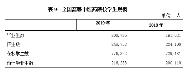2019年,全國高等中醫藥院校畢業生數200,786人、招生數248,758人、在校學生數776,822人、預計畢業生數216,238人。與2018年相比分別增加9,105人、24,658人、47,641人、16,128人,增幅分別為4.8%、11.0%、6.5%、8.1%。(見表9)。