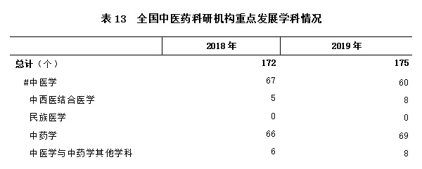 2019年,全國中醫藥科研機構重點發展學科數共計175個,其中:中醫學60個、中西醫結合醫學8個、中藥學69個、中醫學與中藥學其他學科8個。與2018年相比,全國中醫藥科研機構重點發展學科數增加了3個,其中:中醫學減少了7個、中藥學增加了3個、中西醫結合醫學增加了3個、中醫學與中藥學其他學科增加了2個。(見表13)。