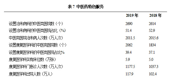 2019年,設置康復醫學科的中醫類醫院(2062個),占39.4%,比上年(37.1%)增加2.3個百分點;康復醫學科床位數5.9萬張、門急診人次數為1177.5萬人次、出院人數為117.9萬人,分別比2018年增加了0.9萬張、140.2萬人次、15.5萬人。(見表7)
