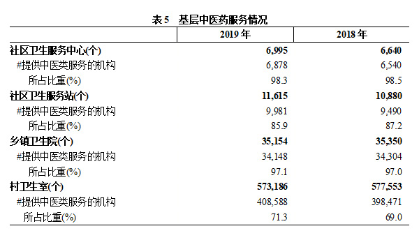 2019年,提供中醫藥服務的社區衛生服務中心、社區衛生服務站、鄉鎮衛生院、村衛室②分別為6878個、9981個、34148個、408588個,所占同類機構比重分別為98.3%、85.9%、97.1%、71.3%,與2018年相比,社區衛生服務中心、社區衛生服務站分別降低0.2、1.3個百分點,鄉鎮衛生院、村衛室分別增長0.1、2.3個百分點(見表5)。