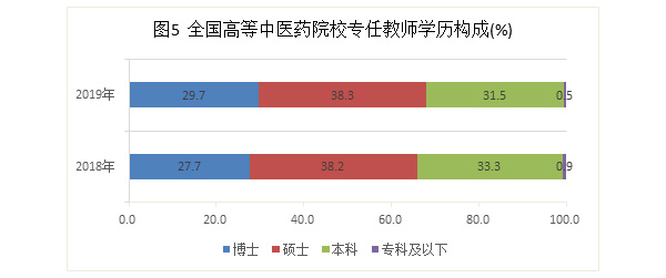 2019年,全國高等中醫藥院校教職工總數達51,570人,其中專任教師31,151人,較2018年增加了1,442人,增幅為4.9%。專任教師中高學歷者所占比例增加明顯,2019年專任教師中博士學歷、碩士學歷分別較2018年增加12.4%、5.3%;本科、??萍耙韵路謩e減少0.9%、34.4%(見圖5)。