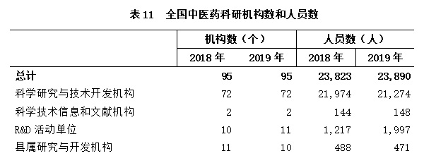 2019年,全國中醫藥科研機構共95個,其中:科學研究與技術開發機構72個;科學技術信息和文獻機構2個;R&D活動單位11個;縣屬研究與開發機構10個。機構數與2018年持平(見表11)。