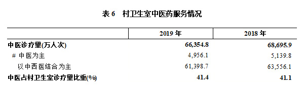 2019年,村衛生室中醫診療量達66354.8萬人次,占村衛生室診療量的41.4%,中醫診療量比2018年減少2341.4萬人次,但占比增長0.3個百分點。