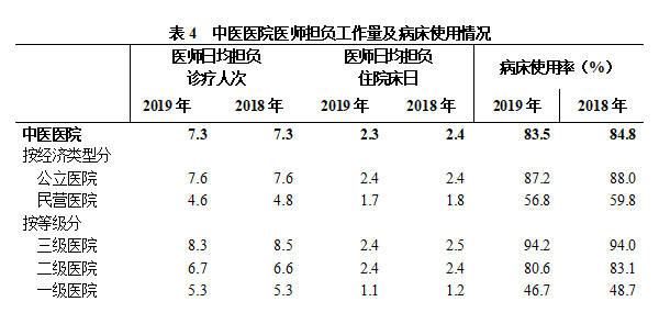 2019年,中醫類醫院醫師日均擔負門診診療7.1人次和住院2.3床日,其中,公立中醫醫院醫師日均擔負門診診療7.6人次和住院2.4床日。公立中醫醫院醫師日均擔負診療人次與全國公立醫院持平,而負擔的住院床日比全國公立醫院低0.2床日。