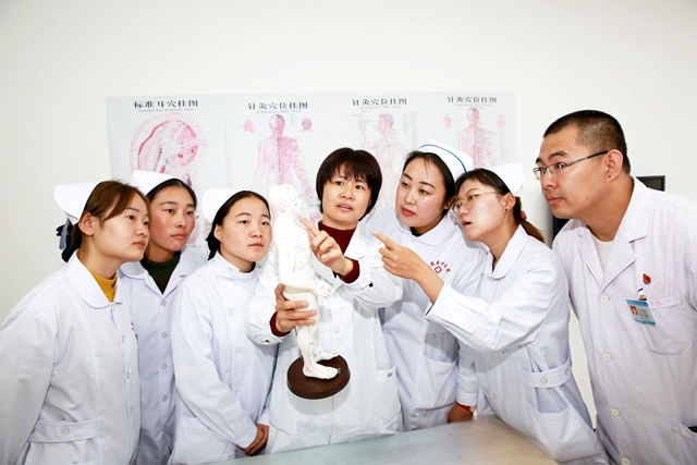 圖為駐點幫扶醫療隊隊長楊怡坤(中)日前在對五寨中醫院醫護人員進行中醫適宜技術培訓。