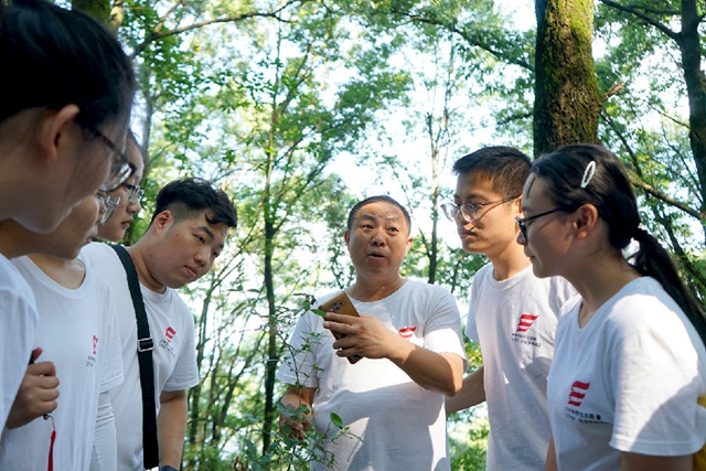 安徽中醫藥大學新安醫學健康扶貧青春行愛心服務隊在安徽省太湖縣鳳凰山開展中藥資源考察活動。服務隊指導老師、安徽省中醫院中藥房朋湯義主任(右三)為同學們實地講解了中藥材原植物辨認、藥用部位、藥性及功效等內容。 李家劼/攝