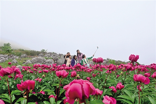 湖南省雙峰縣甘棠鎮地處婁邵干旱走廊,石漠化非常嚴重,頑石遍野。近年來,該鎮因地制宜,以省級扶貧村祠堂灣、四方村等為中心,發動貧困群眾加入合作社連片種植芍藥、百合等耐旱中藥材,打造集藥材種植、觀光旅游于一體的產業扶貧基地。4月13日,該縣舉行“2018雙峰·甘棠首屆芍藥花文化旅游節”,吸引了眾多游客前來觀賞。圖為游客在芍藥花基地游玩。