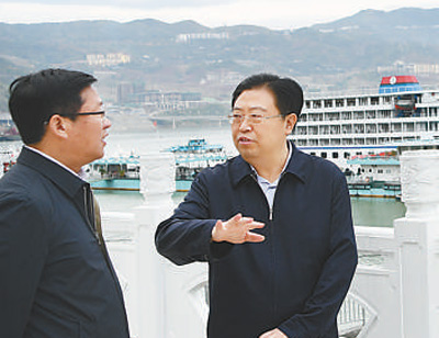 李春奎(右)在巫山旅游碼頭調(diào)研旅游發(fā)展情況。