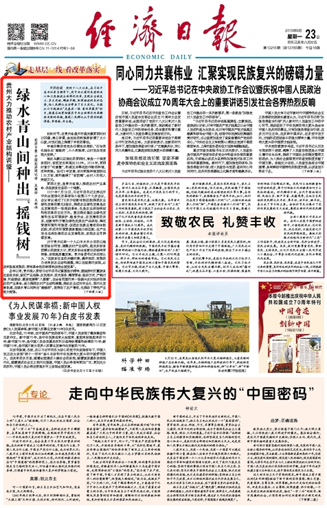 今天,《經濟日報》頭版頭條推出“走基層一線看改革落實”欄目,開篇文章關注貴州農村產業結構調整。文章以《貴州大力推動農村產業結構調整——綠水青山間種出“搖錢樹”》為題,講述了如今的貴州,“什么賺錢種什么、什么賺錢養什么”成為農民選擇產業的重要考慮因素,一些地方“農村祖祖輩輩種玉米”的傳統、“樣樣都有樣樣都不成規模”的歷史正在加快改變,充滿希望的特色產業正在加快成長。