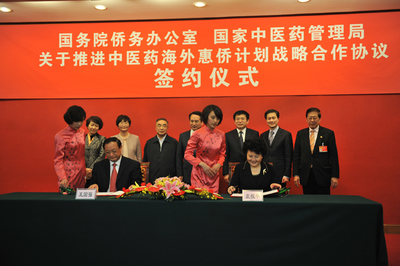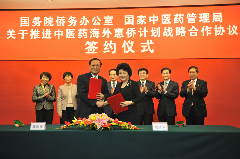 根據《國務院關于扶持和促進中醫藥事業發展的若干意見》和《中醫藥對外交流與合作中長期規劃綱要(2011-2020)》,以及國務院僑務辦公室“海外惠僑工程——中醫關懷計劃”整體部署,為整合兩部門資源,進一步促進中醫藥海外發展、服務以華人華僑為代表的世界人民健康福祉,2015年3月6日,國務院僑務辦公室和國家中醫藥管理局在京簽署《關于推進中醫藥海外惠僑計劃的戰略合作協議》。 近年來,中醫藥“走出去”得到國家領導人的高度關注,同時僑務工作也面臨重要發展機遇期。國務院僑務辦公室和國家中醫藥管理局經過協商,決定簽署戰略合作協議,將推動中醫藥海外發展和惠僑工作納入各自長期發展規劃,發揮各自優勢,促進中國特色醫藥衛生事業和僑務工作共同發展。雙方將以簽署戰略協議為契機,進一步密切合作,制定年度合作計劃,在“海外惠僑工程——中醫關懷計劃”框架下組織中醫海外義診活動,開展海外中醫師培訓,推動海外華人醫院與國內中醫院開展合作,加大中醫關懷宣慰僑胞力度,充分發揮海外僑胞作用,提升海外中醫行業水平和形象,擴大中醫藥在世界范圍影響力。 國務院僑務辦公室主任裘援平和國家衛生計生委副主任、國家中醫藥管理局局長王國強作為雙方代表簽署了上述協議。國務院僑辦副主任譚天星、國家中醫藥管理局副局長于文明以及38位華人華僑代表出席并見證了簽約儀式。
