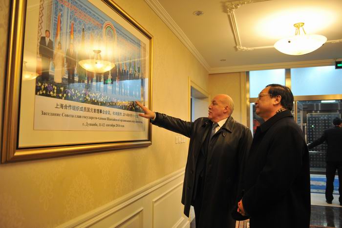 王國(guó)強(qiáng)回訪上海合作組織秘書處-梅津采夫向王國(guó)強(qiáng)介紹上合組織發(fā)展歷程