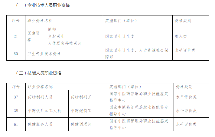 職業資格目錄清單明確了國家職業資格范圍,實施機構和設定依據,有利于從源頭上解決職業資格過多過濫的問題。其中專業技術人員的職業資格實施部門(單位)為國家衛生計生委等,國家中醫藥管理局負責中醫類別,具體實施機構為國家中醫藥管理局中醫師資格認證中心;技能人員的職業資格實施部門(單位)為國家中醫藥管理局職業技能鑒定指導中心。