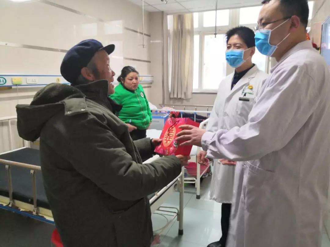 大年初一的早上,楊興奎、李召輝像往常一樣進(jìn)行查房,詢問患者身體狀況,為臥床患者制定治療計(jì)劃,并為患者和陪護(hù)的家人送去新年的第一聲祝福與提前準(zhǔn)備的小禮盒。