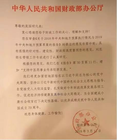 3月7日下午,在代表小組會議,審查計劃報告時,龐國明認為,在健康中國建設方面缺少中醫藥的內容。為此,他提出相關建議,并在3月11日收到了財政部的回復,表示已在預算報告中增加“支持中醫藥事業傳承創新發展”。