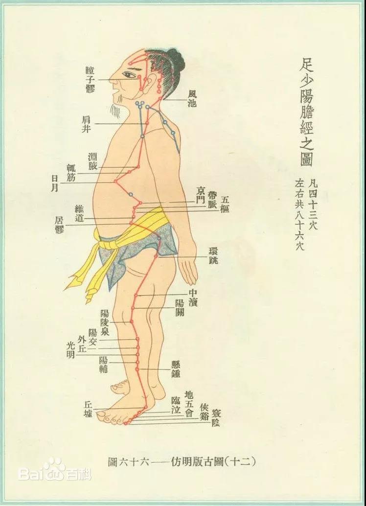 《黃帝內經》上說:“凡十一臟,取決于膽也。”足少陽膽經起于眼外角,向上達額角部,下行至耳后風池穴,由頸、肩進入鎖骨上窩;直行脈走到腋下,沿胸腹側面,在髖關節與眼外角支脈會合,然后沿下肢外側中線下行;經外踝前沿足背到足第四趾外側端。
