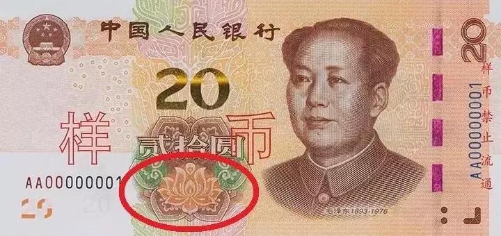 20元紙幣的水印和正面花團中的花都是荷花,另外5角硬幣的背面圖案也是荷花。