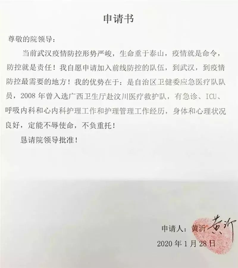 廣西中醫(yī)藥大學(xué)第一附屬醫(yī)院14個(gè)科室的護(hù)理人員(除休產(chǎn)假人員外)全員請(qǐng)戰(zhàn)。有的護(hù)士提前結(jié)束休假,在回程的車上寫下戰(zhàn)書……作為醫(yī)院的護(hù)理部主任,黃沂在看到護(hù)士們的請(qǐng)戰(zhàn)書時(shí)內(nèi)心充滿了感動(dòng)。她在自己的請(qǐng)戰(zhàn)中這樣寫到:“當(dāng)前武漢疫情防控形勢(shì)嚴(yán)峻,生命重于泰山,疫情就是命令,防控就是責(zé)任!我自愿申請(qǐng)加入前線防控的隊(duì)伍,到武漢,到疫情防控最需要的地方!我的優(yōu)勢(shì)在于:是自治區(qū)衛(wèi)生健康委應(yīng)急醫(yī)療隊(duì)隊(duì)員,2008年曾入選廣西赴汶川醫(yī)療救護(hù)隊(duì)(待命出發(fā)),有急診、ICU、呼吸內(nèi)科和心內(nèi)科護(hù)理工作和護(hù)理管理工作經(jīng)歷,身體和心理狀況良好,定能不辱使命,不負(fù)重托!”