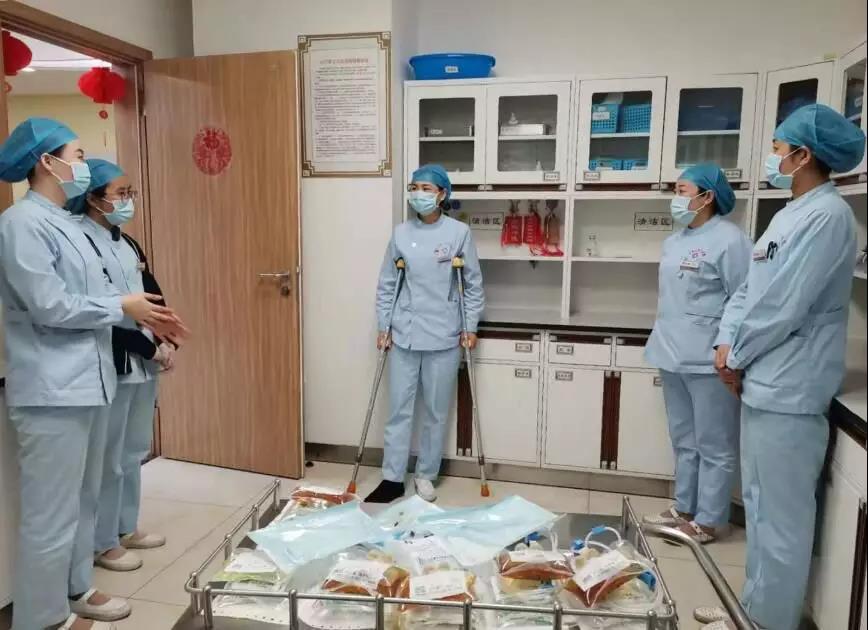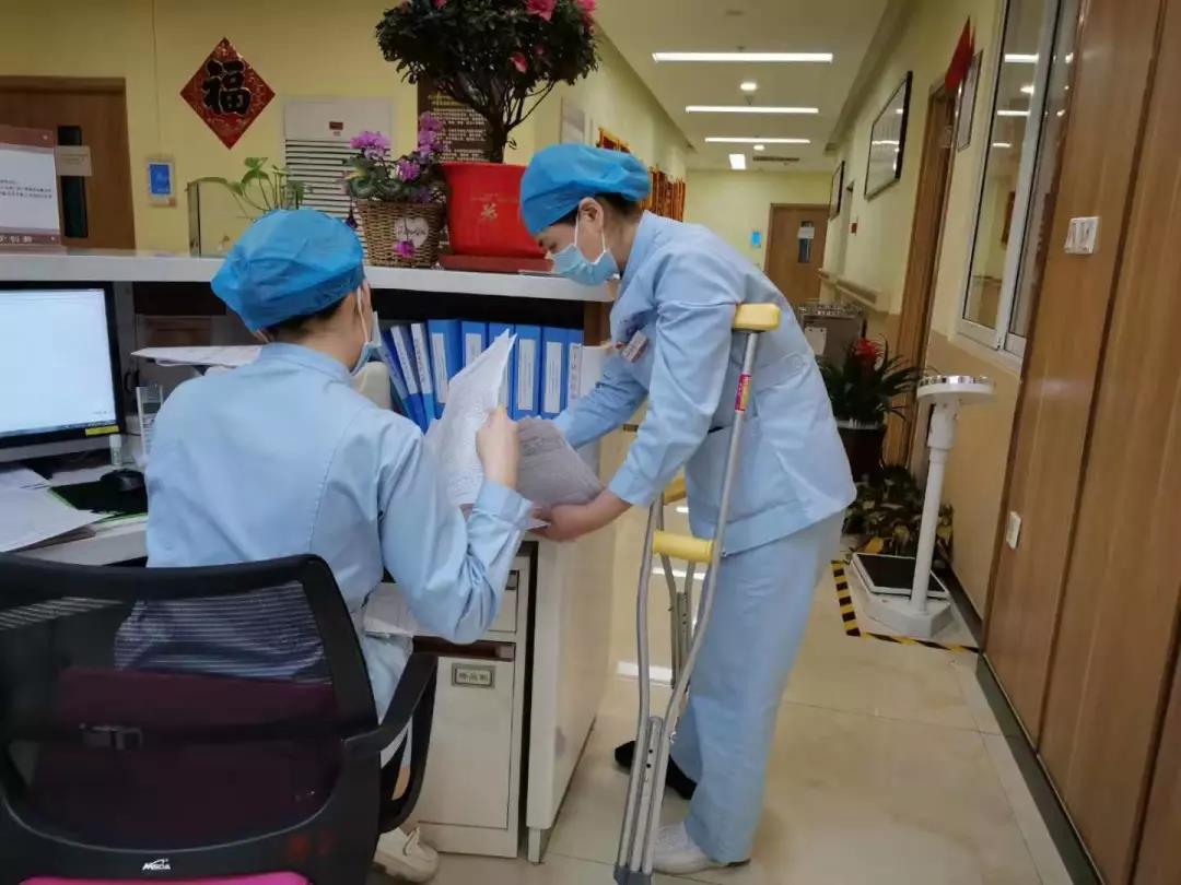 護(hù)理查房,處理醫(yī)囑,收治病人,防疫指導(dǎo),健康宣教…….每天畢靖靖護(hù)士長(zhǎng)還是和往常一樣,早早的來(lái)到病房,開(kāi)始新的一天緊張的護(hù)理工作。一刻也不放松,一刻也不停歇,樂(lè)觀的笑容總是浮現(xiàn)在她的臉上,而一整天下來(lái),帶著沉重石膏的右腳經(jīng)常都是腫脹的,架起拐杖的胳膊也時(shí)常酸痛難忍,本來(lái)不熱的季節(jié)汗水卻常常打濕了衣裳……為了不耽誤工作,也為了不讓同事們擔(dān)心,她總是默默忍受著,有時(shí)實(shí)在疼的受不了便偷偷躲在治療室,運(yùn)用自己多年的骨科護(hù)理經(jīng)驗(yàn)處理受傷的右腳,稍稍緩解忙碌的身影便又出現(xiàn)在了病房中。