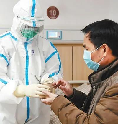 2月18日,在江西中醫(yī)藥大學(xué)附屬醫(yī)院撫生院區(qū)新冠肺炎患者的隔離病房?jī)?nèi),護(hù)士將中藥湯劑端給患者。