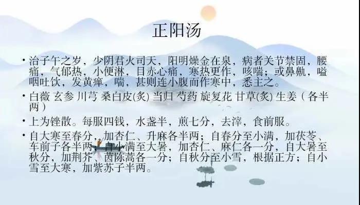 據劉威介紹,正陽湯最早出自宋朝陳無擇所著的《三因司天方》,是根據中醫五運六氣、天人合一的理論所創立的處方。正陽湯主要由白薇、桑白皮、旋復花、玄參、白芍、當歸、川芎、生姜、甘草等藥物組成。