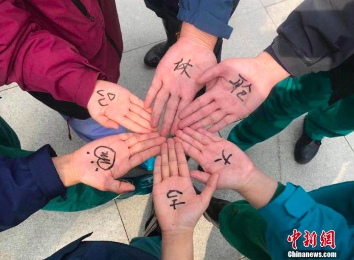 醫護人員在手心里寫著“休艙大吉”。