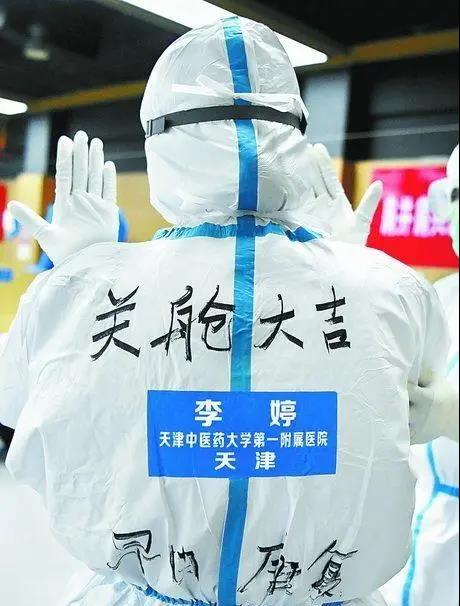 天津醫(yī)療隊(duì)隊(duì)員最后一次在方艙里上班,防護(hù)服背后寫著“關(guān)艙大吉”“早日康復(fù)”。北京晚報(bào)記者 景一鳴攝