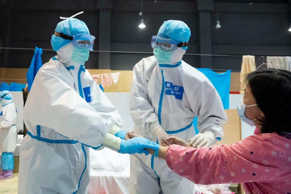 2月25日,在江夏方艙醫院,湖南中醫藥大學第一附屬醫院副院長、江夏方艙醫院副院長朱瑩(左)和湖南中醫藥大學第一附屬醫院醫生戴飛躍(中)為一名新冠肺炎患者號脈。新華社記者沈伯韓攝影