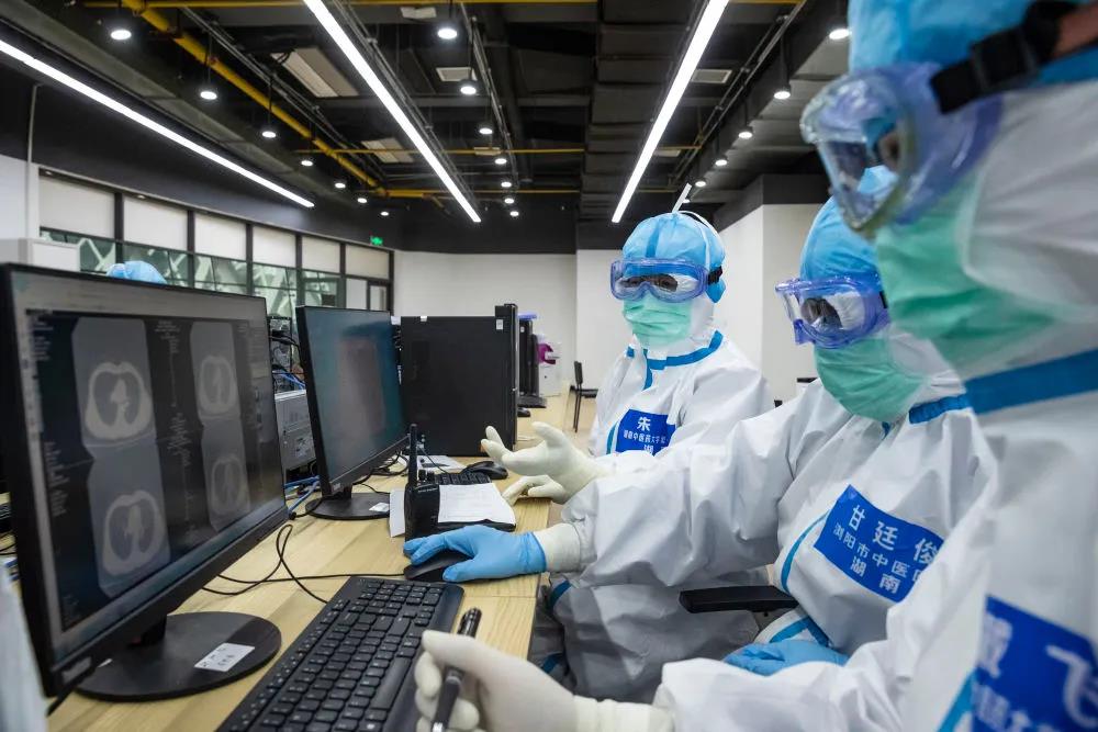 2月25日,在江夏方艙醫院,湖南省中醫藥大學第一附屬醫院副院長、江夏方艙醫院副院長朱瑩(左一)與湖南醫護人員一道,查看新冠肺炎患者的CT影像結果,確認其是否可以出院。武漢江夏方艙是武漢首個以中醫院運轉模式來進行臨床治療、管理的方艙醫院。新華社記者沈伯韓攝影