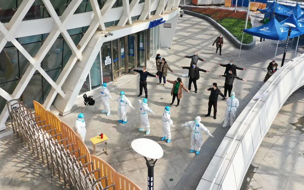 3月10日,在江夏方艙醫院,醫護人員教即將出艙的新冠肺炎治愈患者練習八段錦(無人機照片)。新華社記者才揚攝影