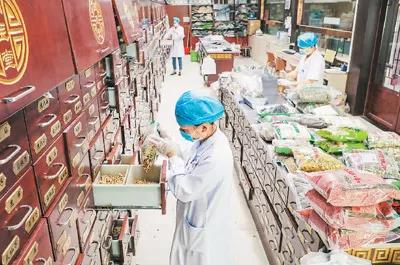 山東省滕州市中醫(yī)醫(yī)院中藥師將中藥材裝斗。宋海存攝(人民視覺(jué))