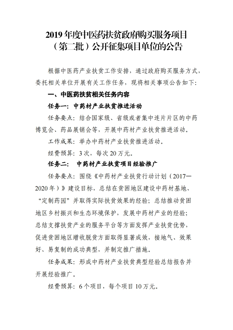2019年度中醫藥扶貧政府購買服務項目(第二批)公開征集項目單位的公告