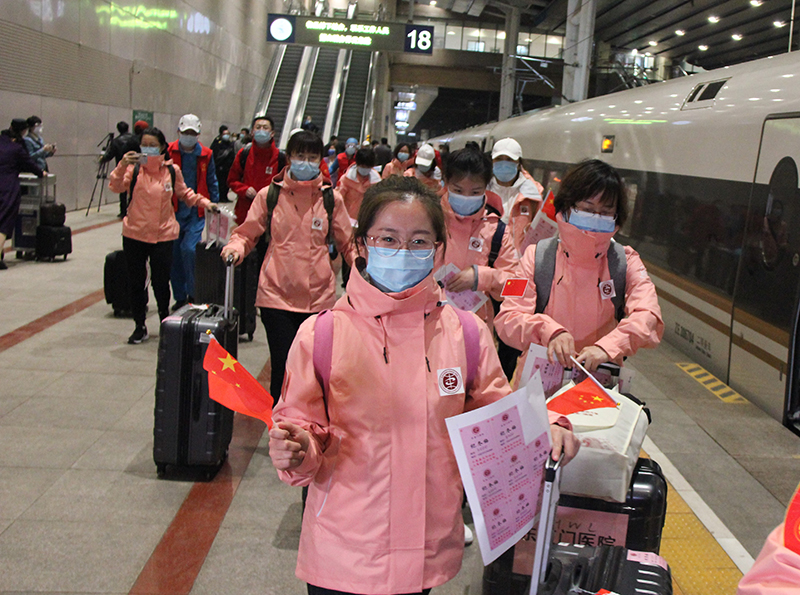 3月25日晚上21時(shí)10分,國家中醫(yī)醫(yī)療隊(duì)(北京中醫(yī)藥大學(xué)隊(duì))所乘坐的G68次列車緩緩駛?cè)氡本┪髡荆?6名奮戰(zhàn)在湖北武漢抗疫一線的中醫(yī)人凱旋而歸。警車護(hù)送醫(yī)療隊(duì)員從車站到住地,現(xiàn)場迎接人員拉起橫幅,手拿國旗和鮮花,喜迎“白衣英雄”凱旋而歸。全國總工會、國家衛(wèi)生健康委、國家中醫(yī)藥管理局為首批返京國家中醫(yī)醫(yī)療隊(duì)舉行了簡樸熱烈的歡迎儀式,有關(guān)單位領(lǐng)導(dǎo)出席并作交流講話。