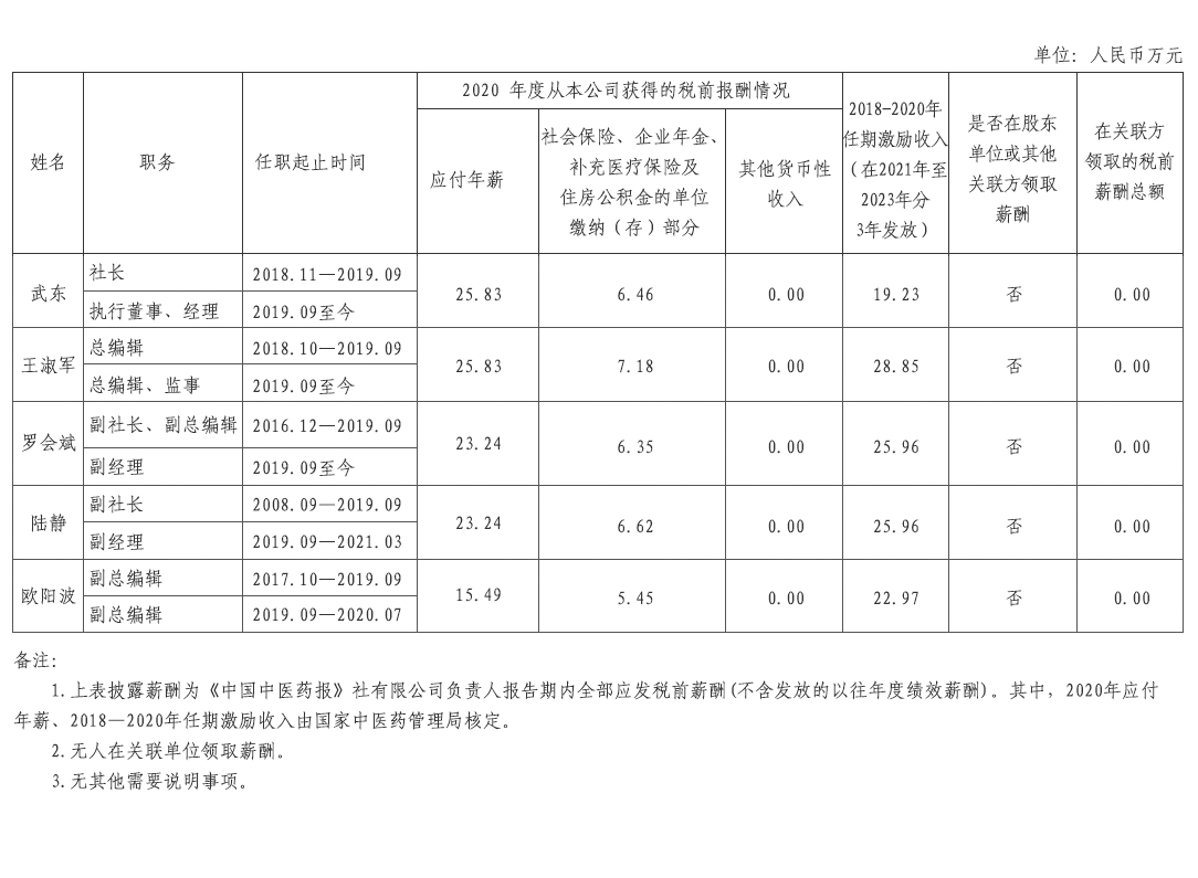 《中國中醫藥報》社有限公司負責人2020年度薪酬情況