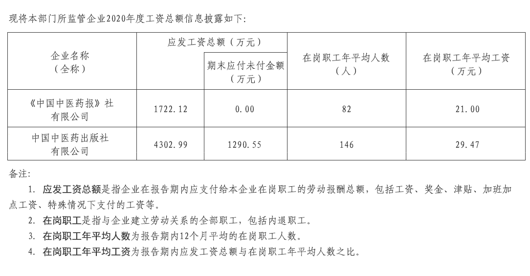 2020年國家中醫藥管理局所監管企業工資總額信息披露