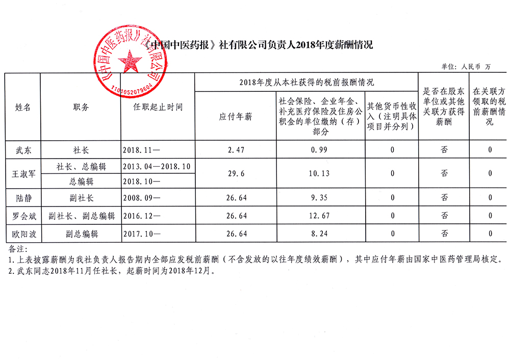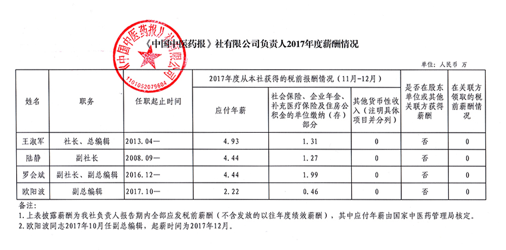 《中國(guó)中醫(yī)藥報(bào)》社有限公司負(fù)責(zé)人2017、2018年度薪酬情況
