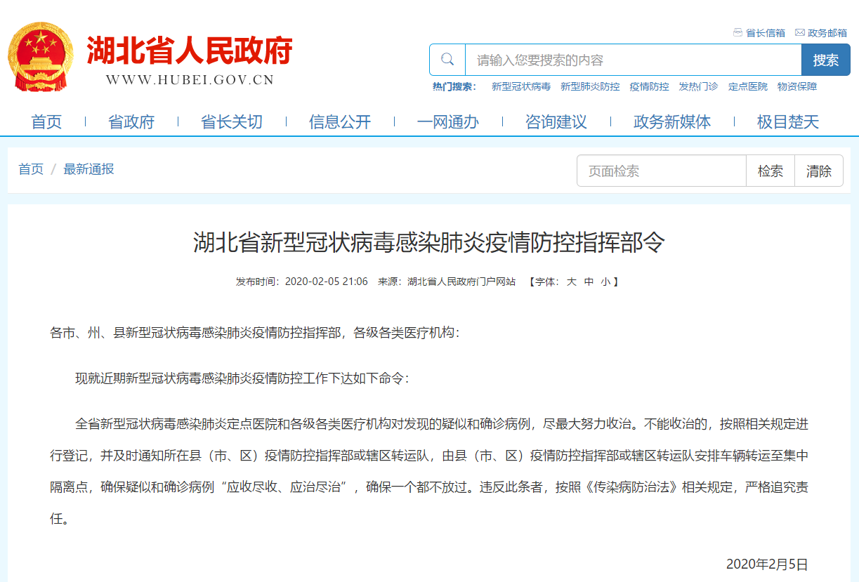 2月5日,湖北省新型冠狀病毒感染肺炎疫情防控指揮部,就近期新型冠狀病毒感染肺炎疫情防控工作下達(dá)命令,命令要求確保疑似和確診病例“應(yīng)收盡收、應(yīng)治盡治”,確保一個(gè)都不放過。違反者,按照《傳染病防治法》相關(guān)規(guī)定,嚴(yán)格追究責(zé)任。命令全文如下: