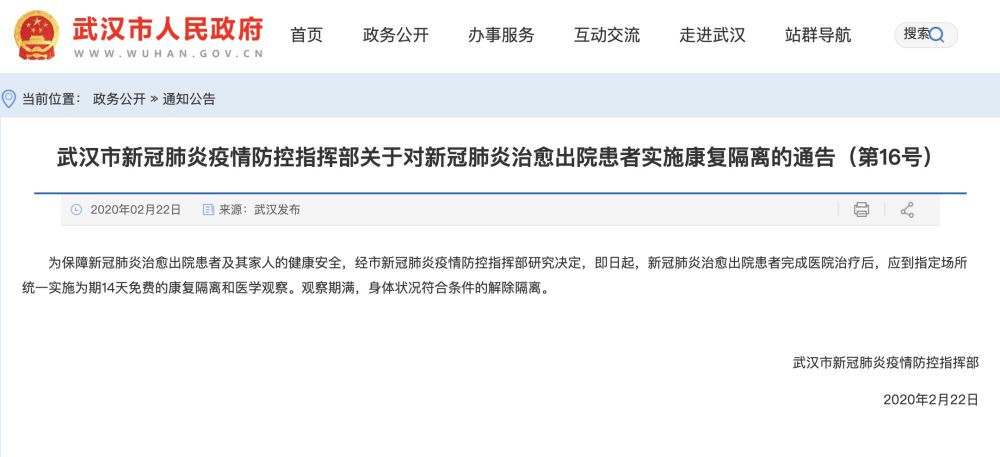 為保障新冠肺炎治愈出院患者及其家人的健康安全,經市新冠肺炎疫情防控指揮部研究決定,即日起,新冠肺炎治愈出院患者完成醫院治療后,應到指定場所統一實施為期14天免費的康復隔離和醫學觀察。觀察期滿,身體狀況符合條件的解除隔離。