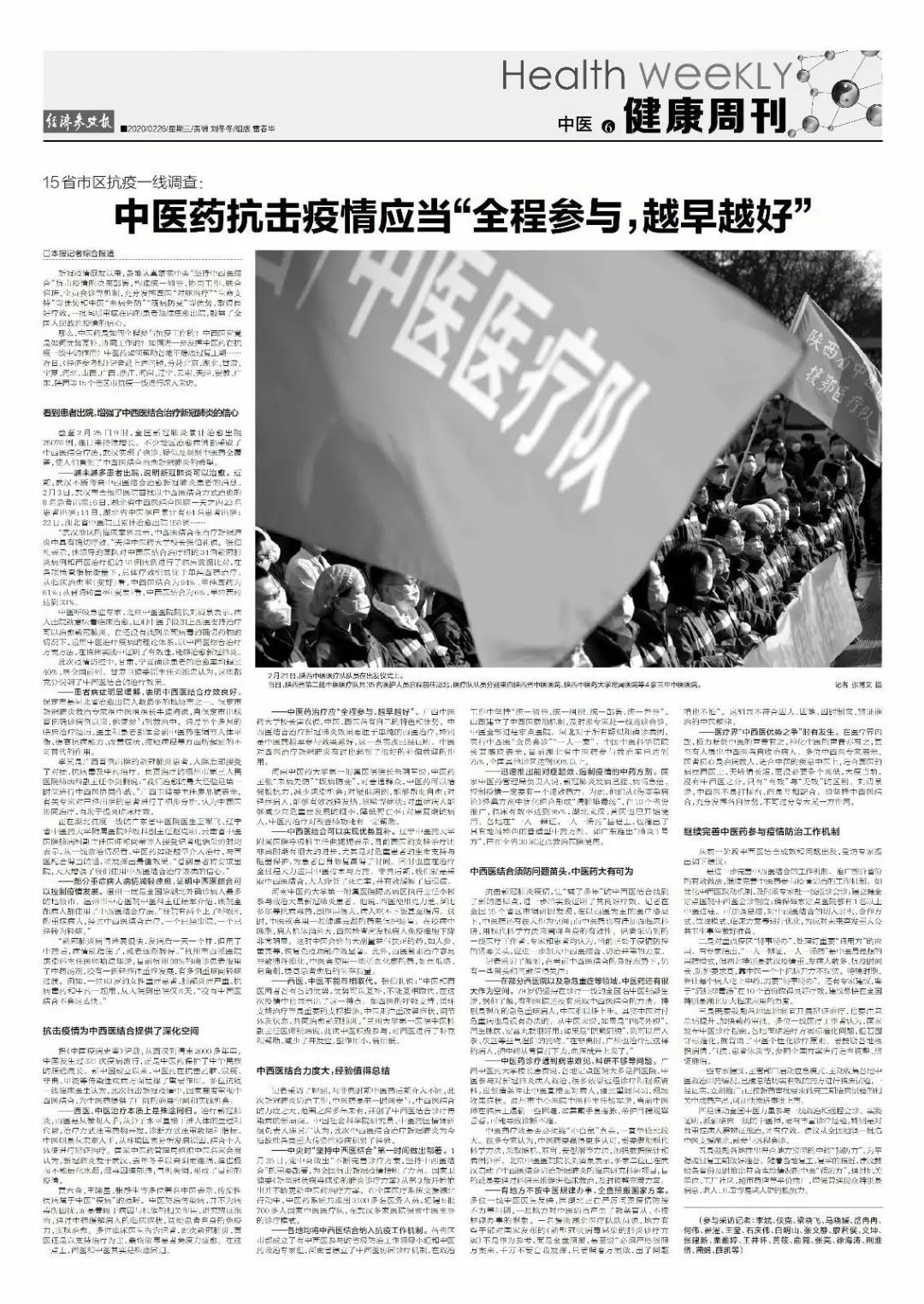 2月26日,新華社《經濟參考報》整版刊發(fā)文章《15省市區(qū)抗疫一線調查:中醫(yī)藥抗擊疫情應“全程參與,越早越好”》。