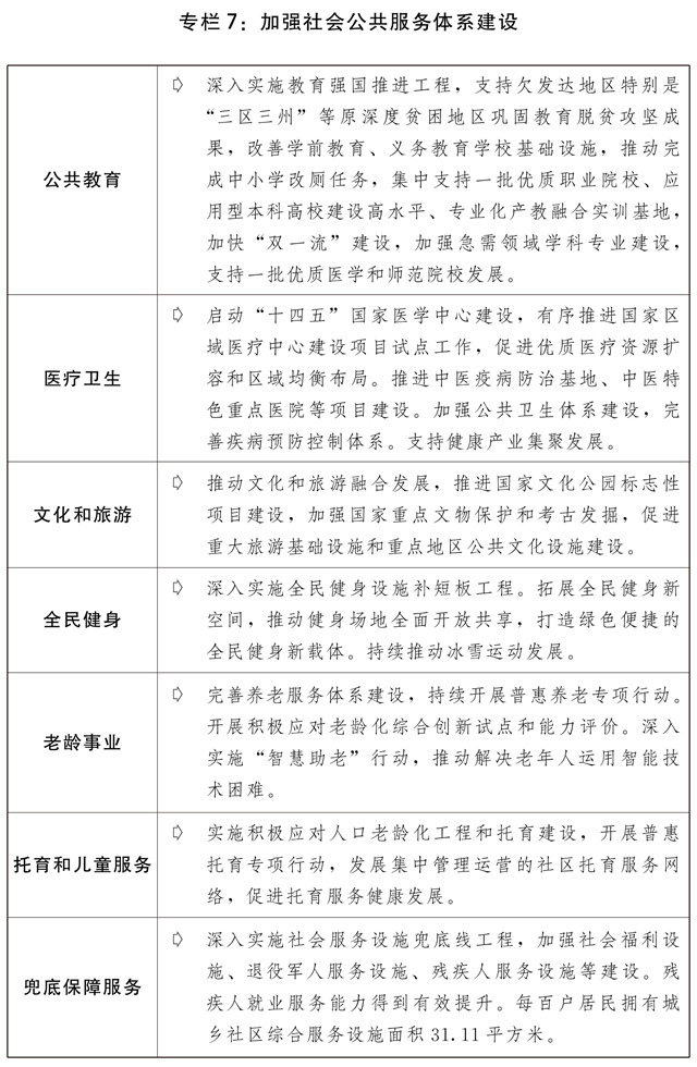 四是完善公共服務政策制度體系。分類推進基本公共服務均等化發(fā)展,推動服務重心向基層下沉,增加普惠性非基本公共服務供給。支持社會力量增加普惠性托育服務供給,進一步完善學前教育收費政策,推進普惠性學前教育資源擴容增效,推進兒童友好城市建設。推動義務教育優(yōu)質(zhì)均衡發(fā)展和城鄉(xiāng)一體化,提升農(nóng)村學校辦學能力,依據(jù)常住人口規(guī)模增加城鎮(zhèn)教育資源。繼續(xù)做好義務教育階段減負工作。加強縣域普通高中建設。改善職業(yè)教育辦學條件。推進高校“雙一流”建設,加快經(jīng)濟社會發(fā)展重點領域急需學科專業(yè)建設、人才培養(yǎng)和科技攻關,完善產(chǎn)教融合政策措施。支持中西部高等教育發(fā)展,高校招生繼續(xù)加大對中西部和農(nóng)村地區(qū)傾斜力度。加強教師隊伍建設,加大中西部地區(qū)教師培訓力度。辦好特殊教育、繼續(xù)教育,規(guī)范民辦教育發(fā)展。完善三孩生育政策配套措施,將3歲以下嬰幼兒照護費用納入個人所得稅專項附加扣除,推動生育支持政策落地見效。貫徹落實積極應對人口老齡化國家戰(zhàn)略,加強養(yǎng)老托育服務體系和健康支撐體系建設,維護好老年人合法權(quán)益。推動公立醫(yī)院高質(zhì)量發(fā)展,加快健全現(xiàn)代醫(yī)院管理制度,深入推進國家醫(yī)學中心、國家區(qū)域醫(yī)療中心建設項目和縣級醫(yī)院建設,加快完善分級診療體系,深化醫(yī)療服務價格、醫(yī)保支付管理和公立醫(yī)院薪酬制度改革。補齊婦幼兒科、精神衛(wèi)生、老年醫(yī)學等服務短板。持續(xù)深入開展愛國衛(wèi)生運動、推進實施健康中國行動,倡導文明健康綠色環(huán)保生活方式。實施現(xiàn)代化疾控體系建設、國家重大傳染病防治基地建設等工程,提升公共衛(wèi)生防控救治能力。加快中醫(yī)藥特色發(fā)展。推動中華優(yōu)秀傳統(tǒng)文化創(chuàng)造性轉(zhuǎn)化和創(chuàng)新性發(fā)展,促進出版、電影、廣播電視、文物等事業(yè)高質(zhì)量發(fā)展,推進公共文化數(shù)字化建設,提供更多公共文化產(chǎn)品。加強國家重大文化項目和國家文化公園建設,加強重要文化遺產(chǎn)和國家公園等重要自然遺產(chǎn)保護設施建設,全面提升革命文物保護利用水平,促進公共文化服務提質(zhì)升級。推進國民旅游休閑加快發(fā)展,不斷完善節(jié)假日制度。實施全民健身設施補短板工程,加強體育公園等全民健身場地設施建設。深化公共法律服務體系建設。